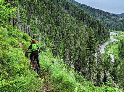 Family riding backcountry North Fork of The Clearwater kids mountain biking adventure by bike